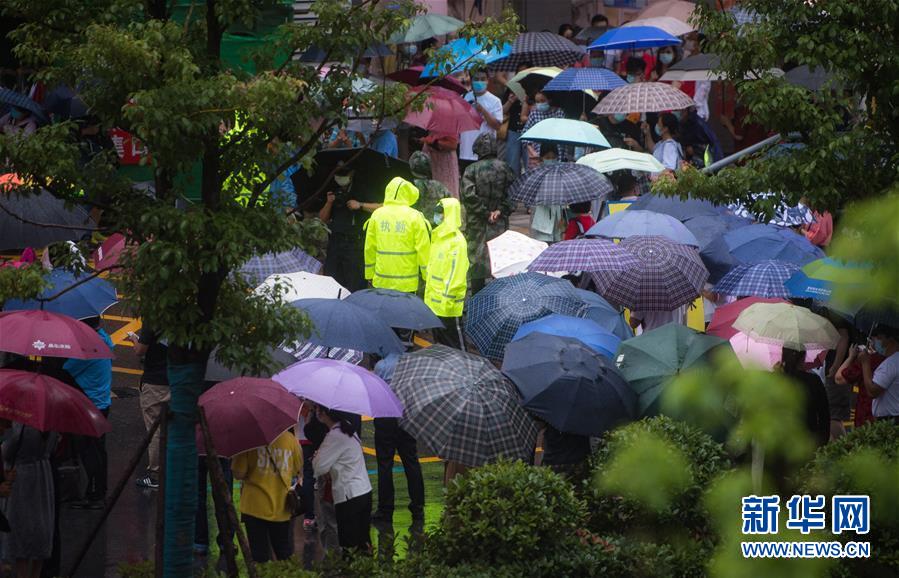 7月7日,在湖北省武漢市東湖中學考點外,民警在雨中執(zhí)勤。當日,2020年高考拉開帷幕。新華社記者肖藝九攝