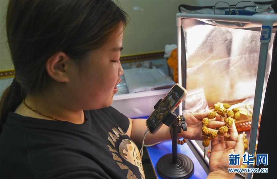 7月7日,河北省永清縣別古莊鎮(zhèn)核雕企業(yè)網(wǎng)絡(luò)主播在網(wǎng)絡(luò)直播銷售核雕產(chǎn)品。河北省永清縣有核雕企業(yè)1500余家,相關(guān)從業(yè)人員4萬余人。今年以來,該縣克服疫情影響,廣泛利用電商平臺進行網(wǎng)絡(luò)直播銷售,網(wǎng)上銷售額已占總銷售額的90%以上,有效緩解了線下銷售壓力,為當(dāng)?shù)貛砹己玫慕?jīng)濟效益。新華社記者李曉果攝