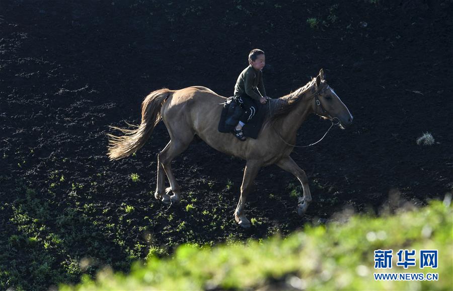 在新疆特克斯縣境內(nèi)的夏牧場(chǎng)里,一名小朋友在草場(chǎng)上騎馬(7月2日攝)。新華社記者王菲攝