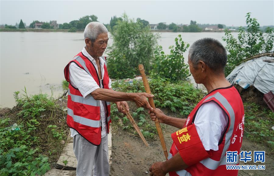 7月9日,在高淳區(qū)陽江鎮(zhèn)永豐圩,巡堤員在進(jìn)行“水牌”(巡堤查險責(zé)任牌)交接。新華社記者季春鵬攝