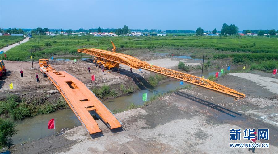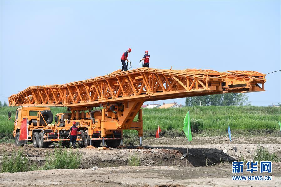 7月10日,工作人員在演練現(xiàn)場搭建機(jī)械化橋梁。當(dāng)日,由吉林省交通運(yùn)輸廳主辦的公路橋梁水毀搶通應(yīng)急演練在長春市雙陽區(qū)雙陽河舉行,參與演練人員從汛情水毀信息報送、應(yīng)急裝備快速集結(jié)、機(jī)械化橋梁搶通搭設(shè)、善后處理等方面進(jìn)行實(shí)戰(zhàn)演練。新華社記者張楠攝