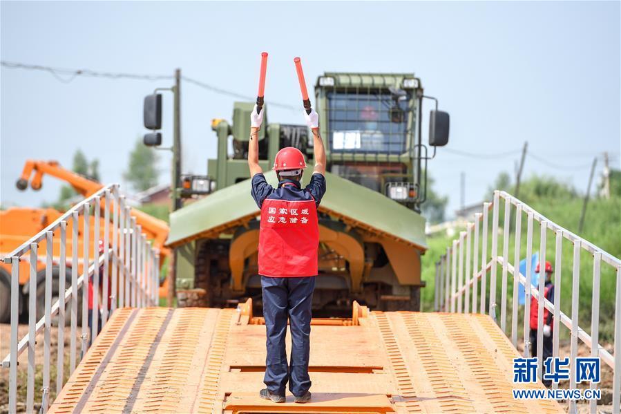 7月10日,工作人員引導(dǎo)多功能應(yīng)急搶險車安全過橋。當(dāng)日,由吉林省交通運(yùn)輸廳主辦的公路橋梁水毀搶通應(yīng)急演練在長春市雙陽區(qū)雙陽河舉行,參與演練人員從汛情水毀信息報送、應(yīng)急裝備快速集結(jié)、機(jī)械化橋梁搶通搭設(shè)、善后處理等方面進(jìn)行實(shí)戰(zhàn)演練。新華社記者張楠攝