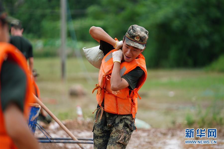 武警戰(zhàn)士在江西省鄱陽縣鄱陽鎮(zhèn)江家?guī)X村搬運沙袋(7月11日攝)。新華社記者 周密 攝