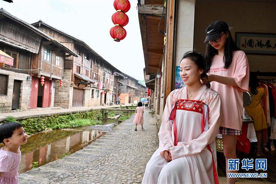 7月4日,游客蘇夢(右二)在浦源村一家漢服租賃店體驗(yàn)漢服文化,她的女兒在一旁好奇地觀看。新華社記者 姜克紅 攝