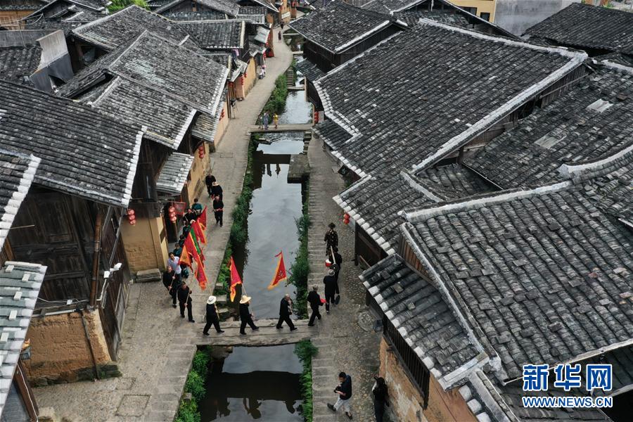 7月4日,浦源村民展示魚祭習(xí)俗(無人機(jī)照片)。魚祭習(xí)俗是為死去的鯉魚舉行送葬儀式,是浦源村特有的習(xí)俗。新華社記者 姜克紅 攝