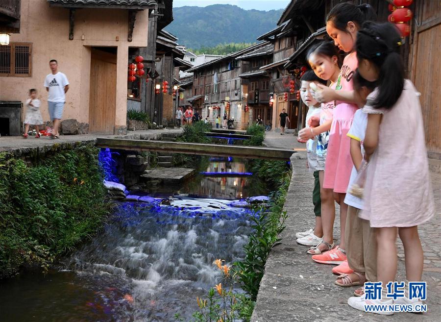 7月3日,小朋友在浦源村鯉魚溪畔喂食溪中的鯉魚。新華社記者 姜克紅 攝