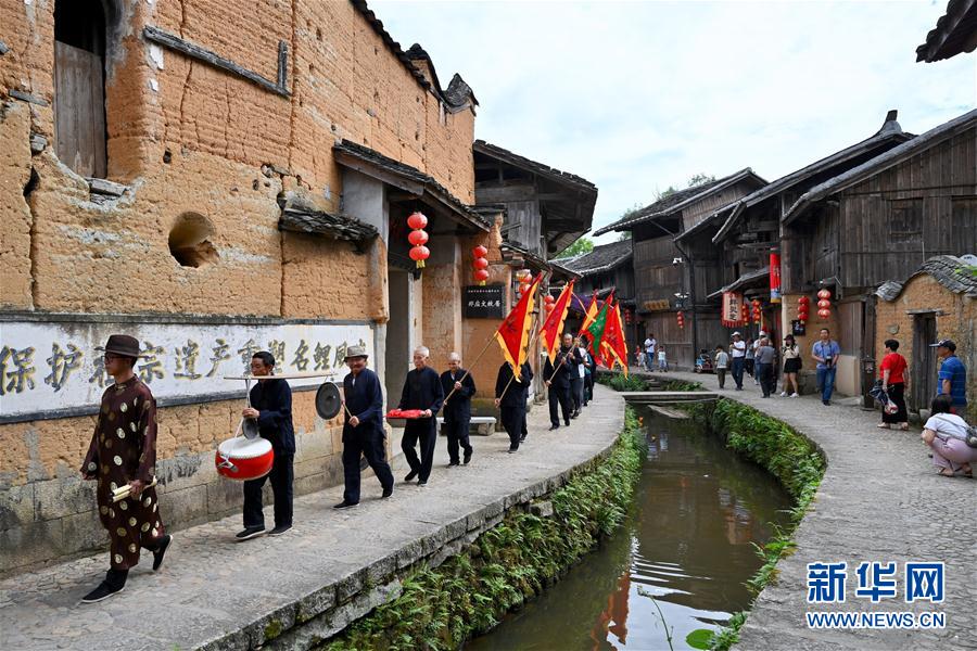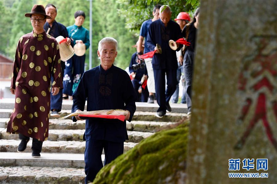 7月4日,浦源村民展示魚祭習(xí)俗。魚祭習(xí)俗是為死去的鯉魚舉行送葬儀式,是浦源村特有的習(xí)俗。新華社記者 姜克紅 攝