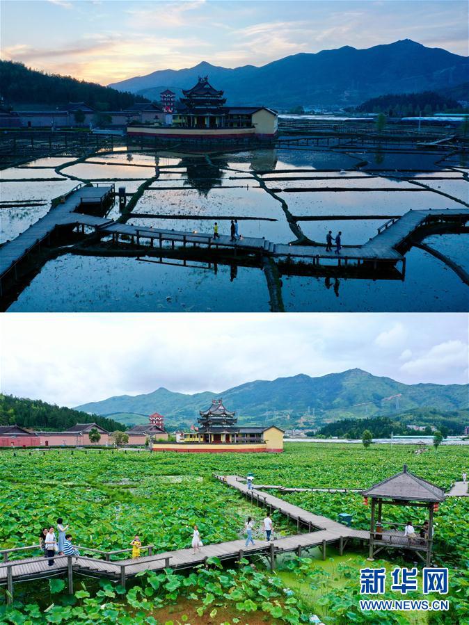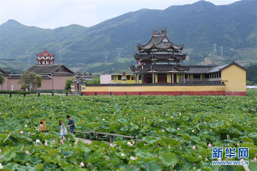 7月3日,浦源村鯉魚溪公園內(nèi)荷花盛開,吸引游人前來觀賞(無人機(jī)照片)。新華社記者 姜克紅 攝