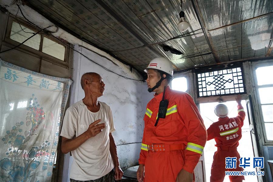 7月12日,消防救援人員在河北省唐山市古冶區(qū)卑家店鎮(zhèn)前巍峰山村村民家中排查。新華社記者 牟宇 攝