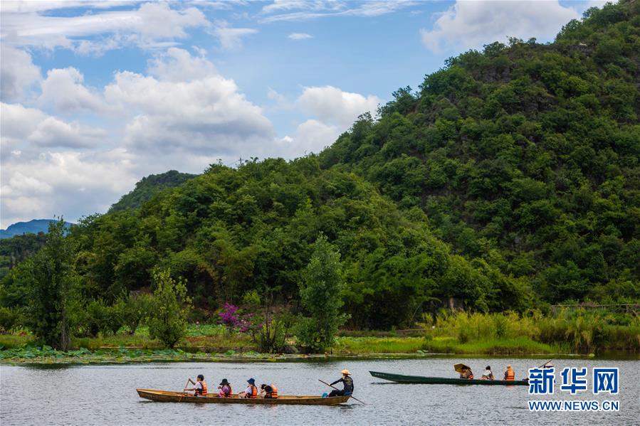 游人在普者黑國(guó)家濕地公園泛舟賞景(7月8日攝)。新華社記者 秦晴 攝