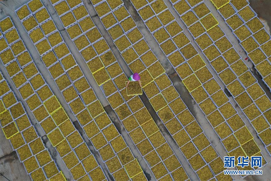 7月12日,祁東縣黃土鋪鎮(zhèn)雁隆食品公司內,工人在晾曬黃花菜(無人機照片)。新華社記者 趙眾志 攝
