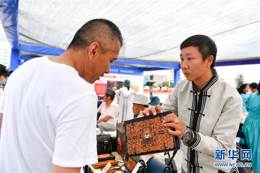 7月12日,在內(nèi)蒙古呼倫貝爾市海拉爾區(qū)惠民展演活動(dòng)的非遺展區(qū),參展商(右)向游客介紹蒙古族皮雕商品。新華社記者 貝赫 攝