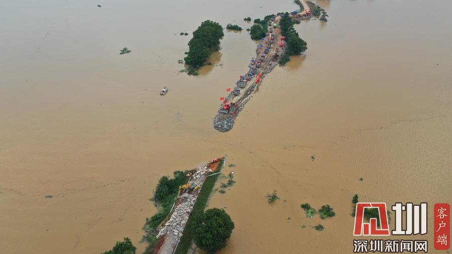 2020年7月13日,江西鄱陽縣問桂道圩,決口封堵進入最后攻堅階段。受持續(xù)強降雨影響,7月8日20時35分,位于江西省上饒市鄱陽縣鄱陽鎮(zhèn)的問桂道圩堤出現(xiàn)漫決險情,導(dǎo)致良田、村莊受淹,受淹村民已安全轉(zhuǎn)移。連日來,中國安能第二工程局在此處對問桂道決口圩堤進占填筑,目前進入最后攻堅階段。