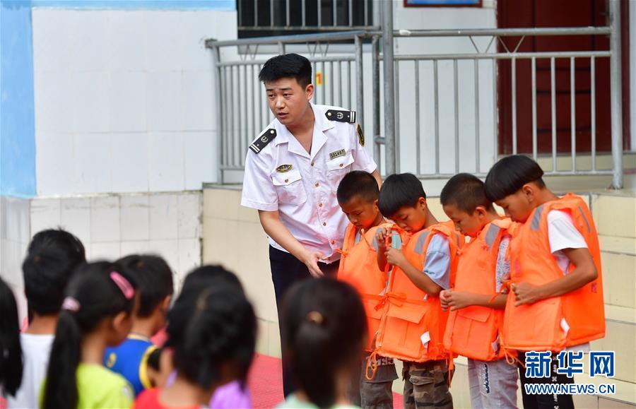 7月13日,在廣西融水苗族自治縣桿洞鄉(xiāng)黨鳩小學(xué),融水海事處工作人員指導(dǎo)學(xué)生穿救生衣。當(dāng)日,廣西柳州融水海事處在桿洞鄉(xiāng)黨鳩小學(xué)開展防溺水及水上交通安全知識(shí)教育活動(dòng),向?qū)W生們普及水上安全知識(shí),并講解水上應(yīng)急救援技能。新華社記者 黃孝邦 攝