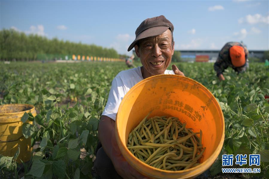 7月14日,在克東縣昌盛鄉(xiāng)青刀豆蔬菜種植示范基地,昌盛鄉(xiāng)安全村脫貧戶丁紹興展示剛摘下的青刀豆。黑龍江省克東縣地處大興安嶺南麓,近年來,當(dāng)?shù)卮罅Πl(fā)展扶貧產(chǎn)業(yè),探索“小院經(jīng)濟(jì)”、訂單種植和加工產(chǎn)業(yè)相融合新方式,帶動農(nóng)民就業(yè)和脫貧增收。新華社記者 王建威 攝