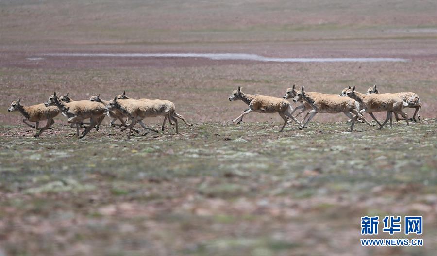 7月7日在可可西里卓乃湖區(qū)域拍攝的一群藏羚羊。目前正值藏羚羊產(chǎn)仔季。來(lái)自青海三江源、新疆阿爾金山、西藏羌塘等地的藏羚羊來(lái)到位于青海省可可西里腹地、被譽(yù)為“藏羚羊大產(chǎn)房”的卓乃湖區(qū)域產(chǎn)仔。新華社記者 張龍 攝