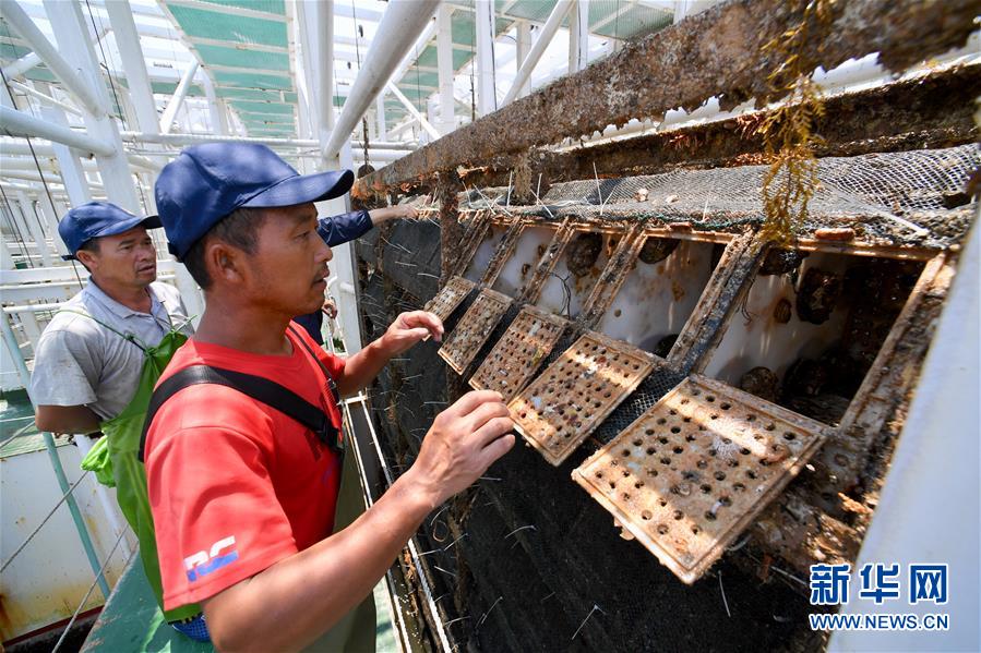 7月14日,在福建省連江縣深遠(yuǎn)海養(yǎng)殖平臺“福鮑一號”上,工人在查看鮑魚長勢。新華社記者 姜克紅 攝