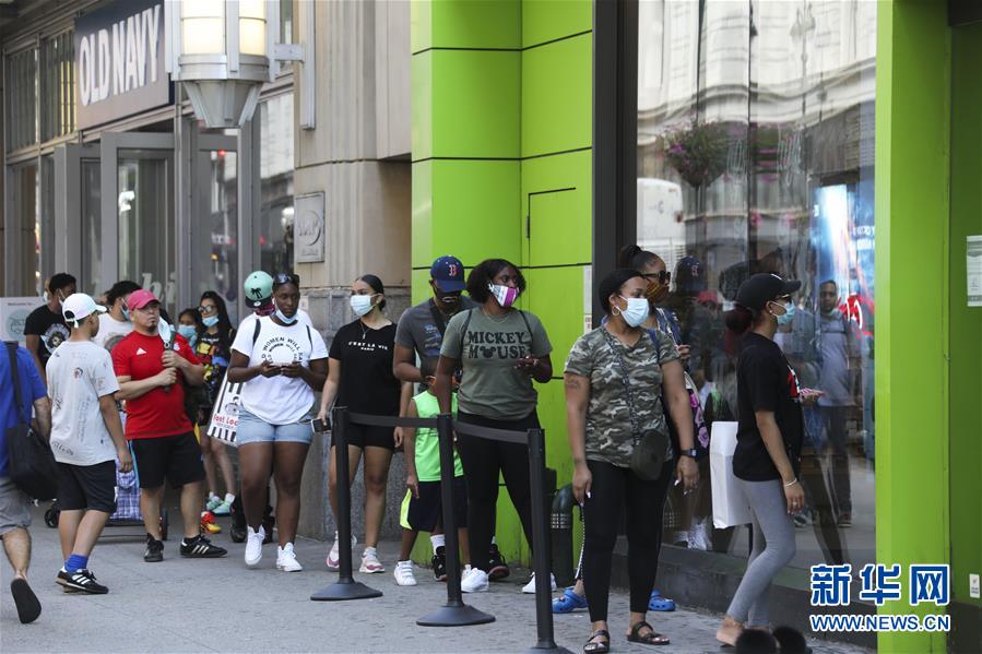 7月14日,人們?cè)诿绹?guó)紐約排隊(duì)等待進(jìn)店購(gòu)物。美國(guó)約翰斯·霍普金斯大學(xué):截至北京時(shí)間15日6時(shí)34分,全球新冠確診病例達(dá)13258016例,死亡病例為576752例。美國(guó)是全球疫情最嚴(yán)重的國(guó)家,確診病例達(dá)3416222例,死亡病例為136319例。新華社記者 王迎 攝