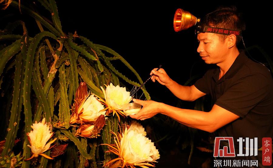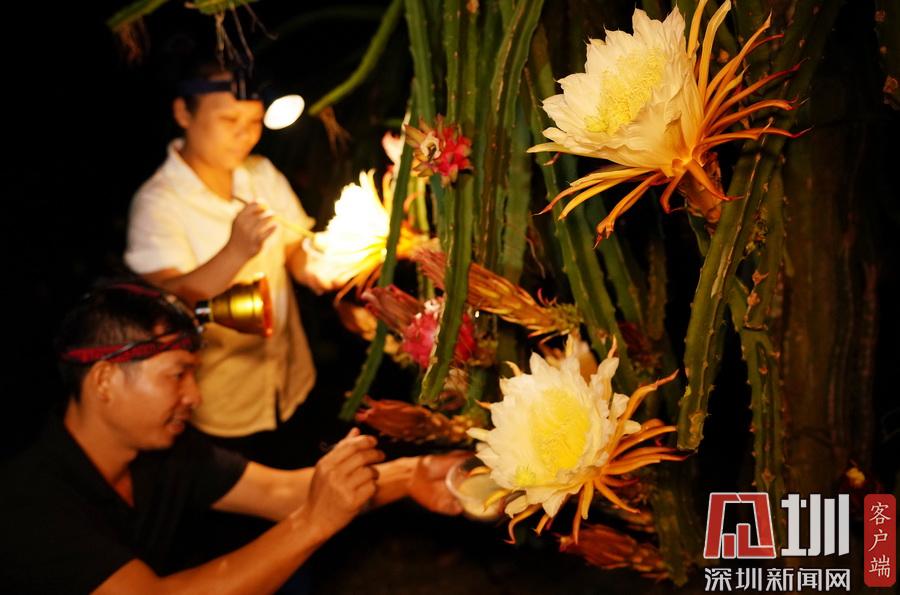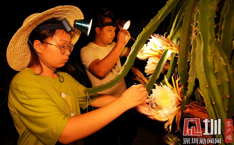 2020年7月14日晚,在廣西融水苗族自治縣融水鎮(zhèn)三合村黎鄧屯,兩名村民正在給紅心火龍果“點花”。