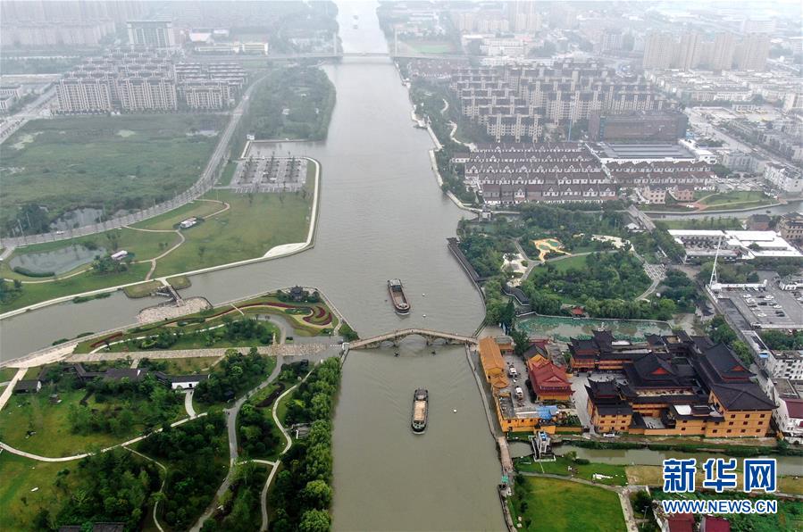 7月17日拍攝的秀洲區(qū)王江涇鎮(zhèn)長虹橋附近的河道(無人機照片)。浙江省嘉興市秀洲區(qū)處在杭嘉湖平原,受持續(xù)強降雨及上游排水影響,近期,秀洲區(qū)境內的京杭大運河分支航道持續(xù)保持較高水位。當地相關部門嚴陣以待,落實各項措施,確保安全度汛。新華社記者韓傳號攝