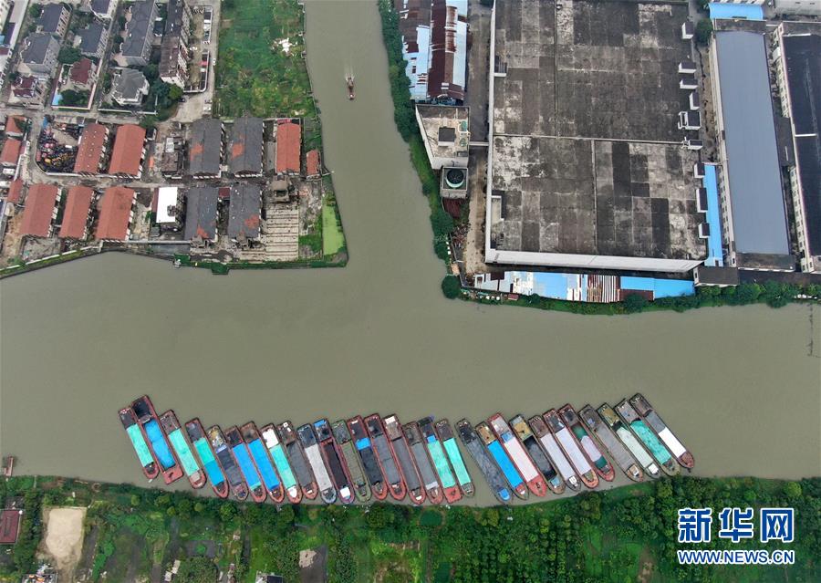 7月17日拍攝的秀洲區(qū)王江涇鎮(zhèn)境內(nèi)京杭大運(yùn)河邊臨時(shí)??康拇埃o(wú)人機(jī)照片)。浙江省嘉興市秀洲區(qū)處在杭嘉湖平原的低洼地帶,受持續(xù)強(qiáng)降雨及上游排水影響,秀洲區(qū)境內(nèi)的京杭大運(yùn)河分支航道持續(xù)保持較高水位。為確保安全度汛,秀洲區(qū)相關(guān)部門(mén)全力以赴做好防汛各項(xiàng)工作。新華社記者韓傳號(hào)攝