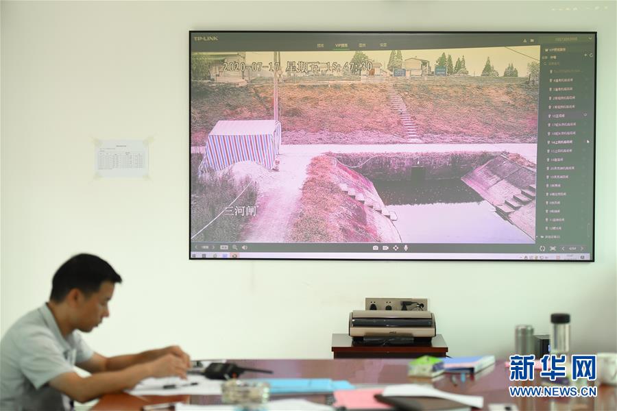 7月17日,在岳陽市華容縣治河渡鎮(zhèn)防汛抗旱指揮所,大屏實時顯示新華垸三門閘附近情況。為力爭安全度汛,湖南省岳陽市華容縣織密人防、物防、技防“三防”網(wǎng)絡(luò),加強應(yīng)急值守和巡查排險工作,采取“以船代倉”“以車代倉”等多種方式靈活儲備防汛物資,在險工險段布置攝像頭實時監(jiān)控,利用無人機對人員難以到達(dá)的位置進行巡查。新華社記者陳澤國攝