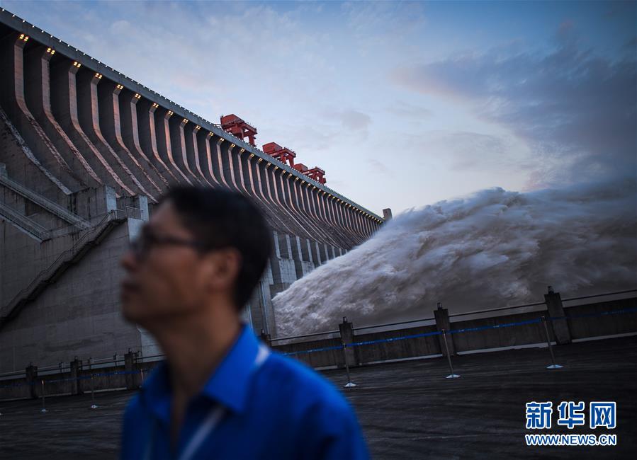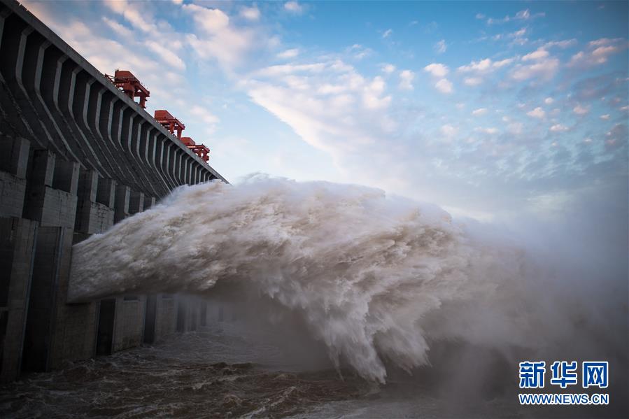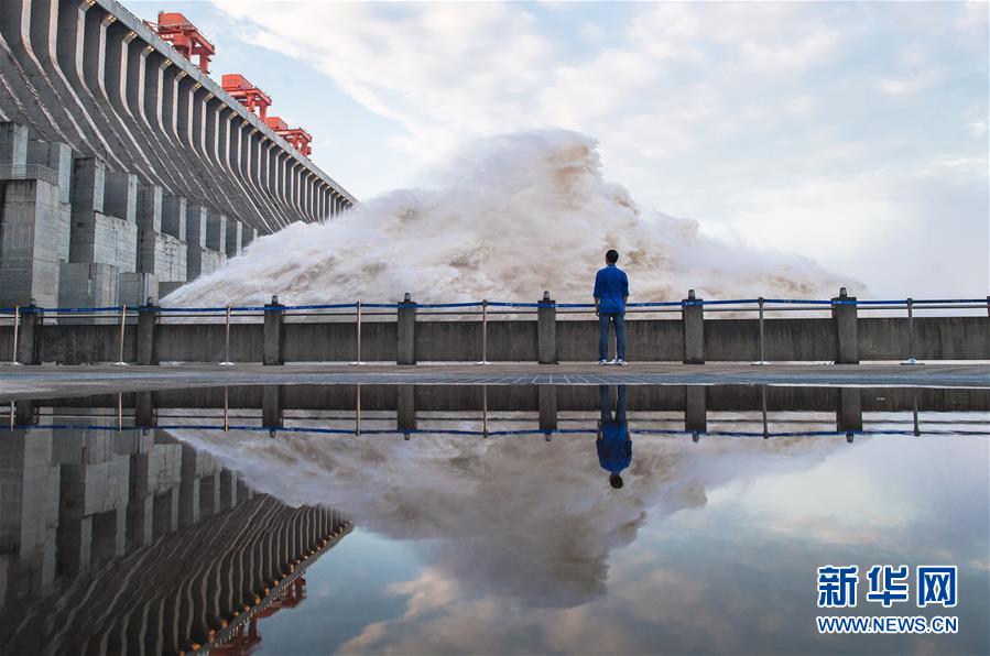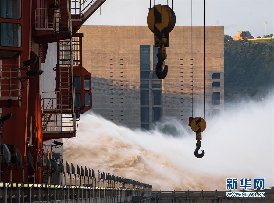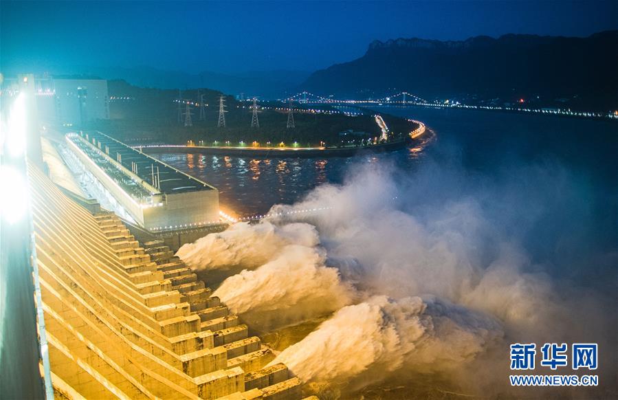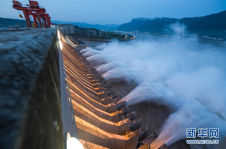 7月19日,三峽樞紐開啟泄洪深孔泄洪。19日20時,三峽水庫入庫流量4.6萬立方米/秒,較本輪洪水的峰值6.1萬立方米/秒下降了1.5萬立方米/秒。“長江2020年第2號洪水”平穩(wěn)通過三峽大壩。新華社記者肖藝九攝