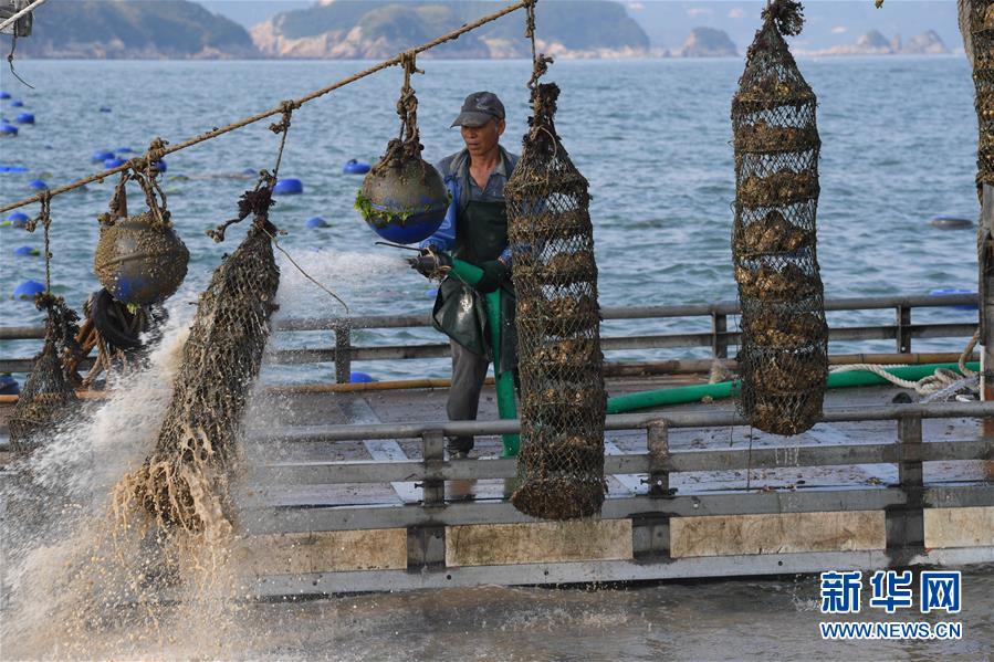 7月16日,在福建省霞浦縣長春鎮(zhèn)海域,收獲生蠔的漁民在沖洗蠔籠。新華社記者姜克紅攝