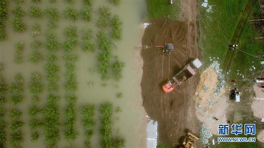 7月20日,在永固垸西線防洪大堤,工作人員處置滲漏險(xiǎn)情(無人機(jī)照片)。
