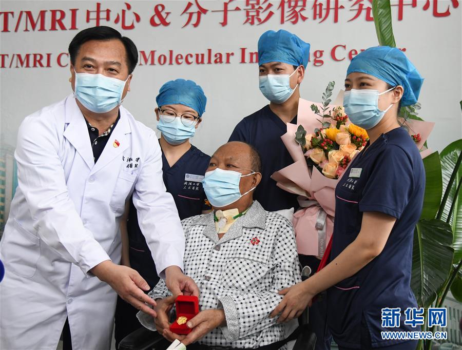 7月21日,武漢大學人民醫(yī)院醫(yī)護人員護送崔先生出院。新華社記者程敏攝