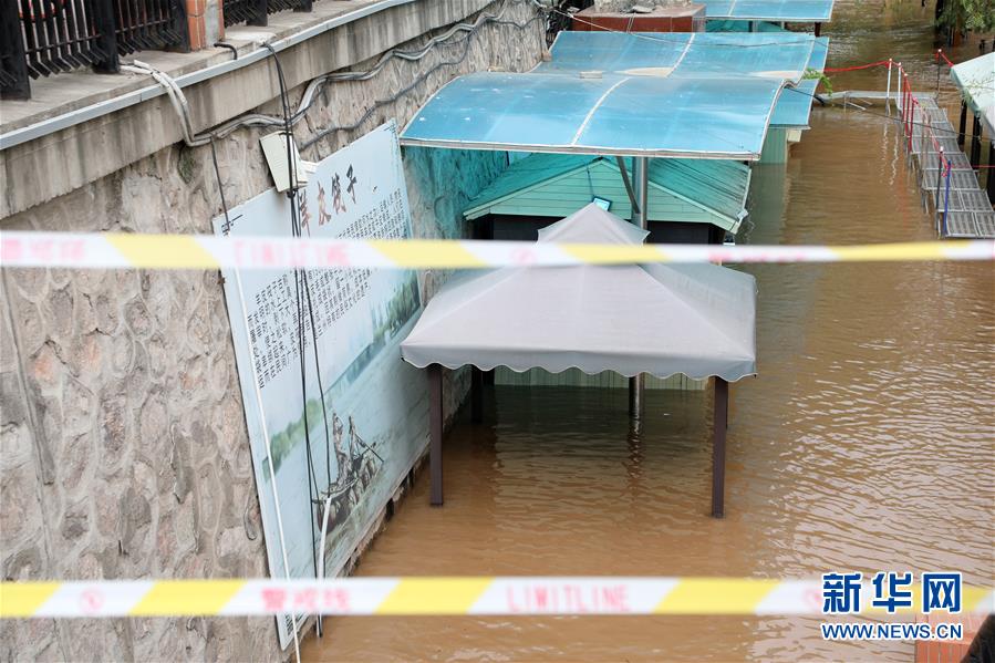 在蘭州市城關(guān)區(qū)黃河蘭州段南岸,被淹的羊皮筏子售票處門(mén)口拉上了警戒線(xiàn)(7月21日攝)。據(jù)了解,受降雨影響,黃河蘭州以上來(lái)水持續(xù)增加,黃河蘭州水文站7月20日20時(shí)42分流量達(dá)到3000立方米每秒,出現(xiàn)黃河2020年第2號(hào)洪水。新華社記者馬莎攝