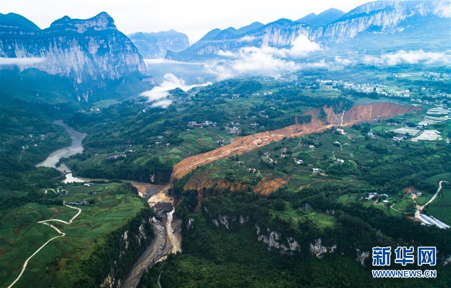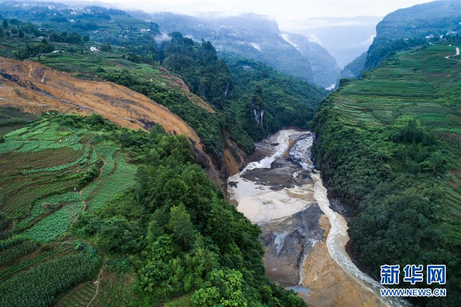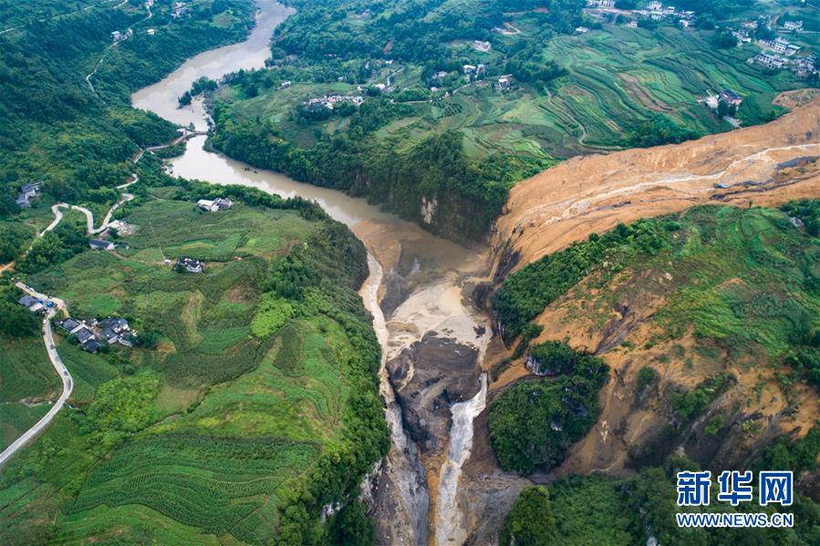 7月22日拍攝的因恩施州屯堡鄉(xiāng)馬者村山體滑坡形成的堰塞湖(無(wú)人機(jī)照片)。