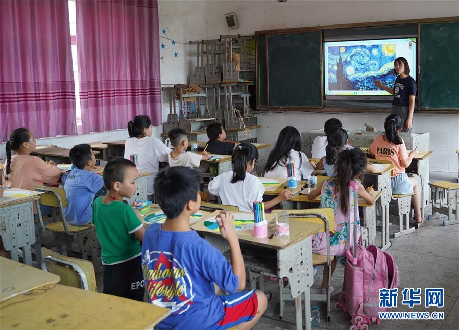 7月23日,在廬山市蛟塘鎮(zhèn)中心小學安置點,老師給孩子們講解美術作品。新華社記者張浩波攝