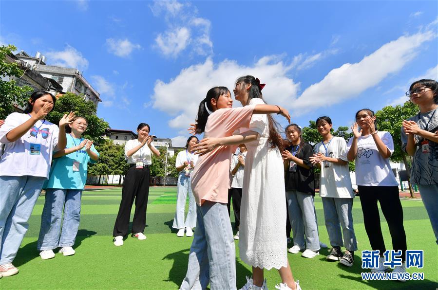 在融水苗族自治縣?;钢袑W1813班舉辦的送別班會上,支教老師林洋港(中右)和同學們擁抱告別(7月23日攝)。新華社記者黃孝邦攝