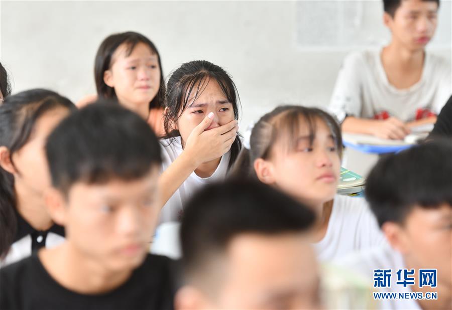 在融水苗族自治縣丹江中學(xué)1708班舉辦的送別班會(huì)上,一名學(xué)生聽到支教老師溫昌浩的臨別寄語時(shí)流淚(7月23日攝)。新華社記者黃孝邦攝