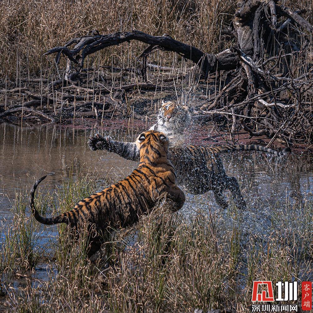 2020年7月27日,猛虎斗有多壯觀?來自印度德里的41歲職業(yè)業(yè)攝影師Nitish Madan,在在印度北部倫滕波爾國家公園游覽時,見證了兩只老虎幼崽激烈的水上爭奪戰(zhàn)。從畫面中可以看到,兩只足足有200磅重的孟加拉虎,面對面互相咆哮,伸出虎爪兇猛至極,才15個月大就已經(jīng)有了王者風范。