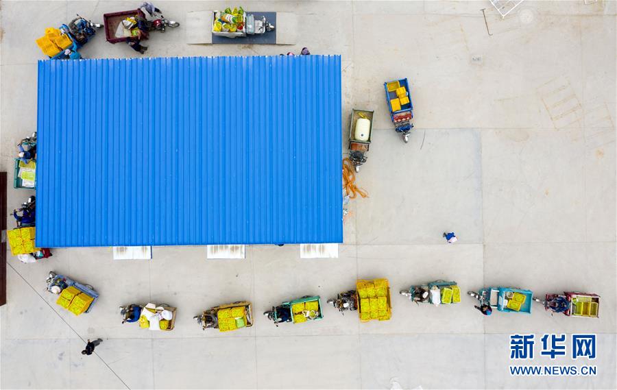在寧夏紅寺堡區(qū)柳泉鄉(xiāng)柳泉村黃花菜晾曬場(chǎng),村民排隊(duì)稱(chēng)重黃花菜(7月11日攝,無(wú)人機(jī)照片)。新華社記者 楊植森 攝