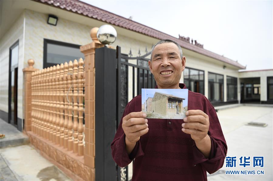 羅宗清在寧夏吳忠市紅寺堡區(qū)新莊集鄉(xiāng)康莊村的新家前展示以前老房子的照片(2019年7月24日攝)。他家于2001年從中衛(wèi)市海原縣搬遷到這里。新華社記者 馮開(kāi)華 攝
