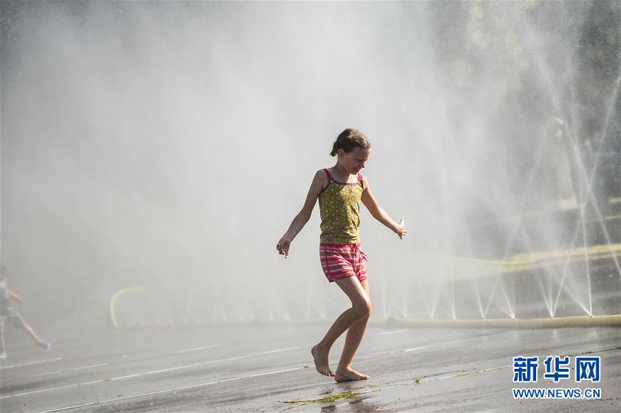 7月28日,在奧地利維也納,一名女孩在一處廣場(chǎng)戲水。新華社記者郭晨攝