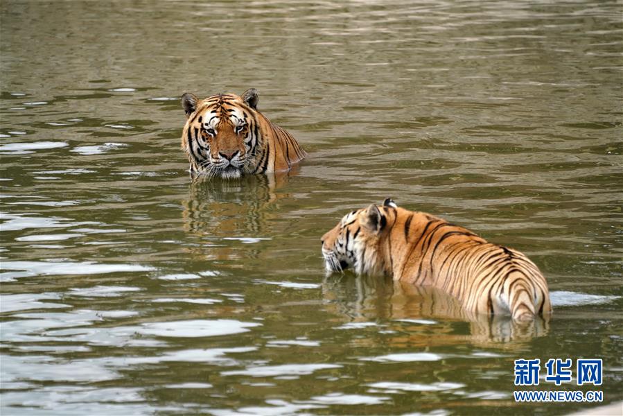7月28日在橫道河子?xùn)|北虎林園拍攝的在水中納涼的東北虎。時(shí)值盛夏,位于黑龍江省海林市的橫道河子?xùn)|北虎林園的東北虎活動(dòng)量減少,以不同方式消夏納涼。新華社記者王建威攝