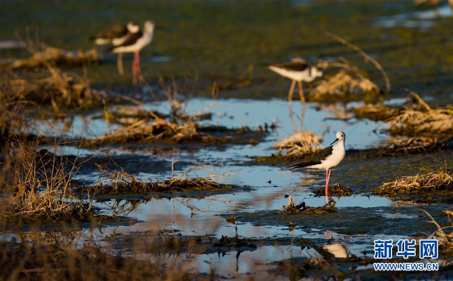 7月28日,長(zhǎng)腳鷸在桃力廟—阿拉善灣海子覓食。鄂爾多斯?jié)竦匚挥趲?kù)布齊沙漠、毛烏素沙地接壤地帶,2002年被列入國(guó)際重要濕地名錄。從2006年開(kāi)始,由于濕地湖面萎縮、湖心島消失,在此筑巢繁殖的世界瀕危物種遺鷗幾近消失。近年來(lái),當(dāng)?shù)夭扇《喾N治理措施,濕地生態(tài)環(huán)境逐步好轉(zhuǎn)。2019年起,濕地內(nèi)的桃力廟—阿拉善灣海子迎來(lái)遺鷗大規(guī)?!盎貧w”。如今,40多種鳥(niǎo)類在此棲息,鄂爾多斯?jié)竦刂匦鲁蔀轼B(niǎo)類的樂(lè)園。新華社記者連振攝