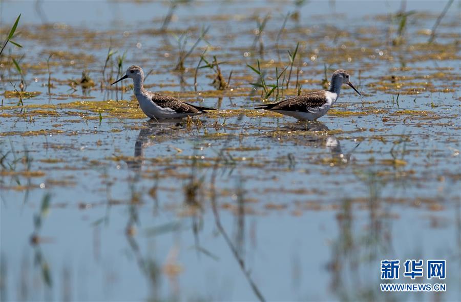 7月28日,兩只長(zhǎng)腳鷸在桃力廟—阿拉善灣海子覓食。鄂爾多斯?jié)竦匚挥趲?kù)布齊沙漠、毛烏素沙地接壤地帶,2002年被列入國(guó)際重要濕地名錄。從2006年開(kāi)始,由于濕地湖面萎縮、湖心島消失,在此筑巢繁殖的世界瀕危物種遺鷗幾近消失。近年來(lái),當(dāng)?shù)夭扇《喾N治理措施,濕地生態(tài)環(huán)境逐步好轉(zhuǎn)。2019年起,濕地內(nèi)的桃力廟—阿拉善灣海子迎來(lái)遺鷗大規(guī)?!盎貧w”。如今,40多種鳥(niǎo)類在此棲息,鄂爾多斯?jié)竦刂匦鲁蔀轼B(niǎo)類的樂(lè)園。新華社記者連振攝