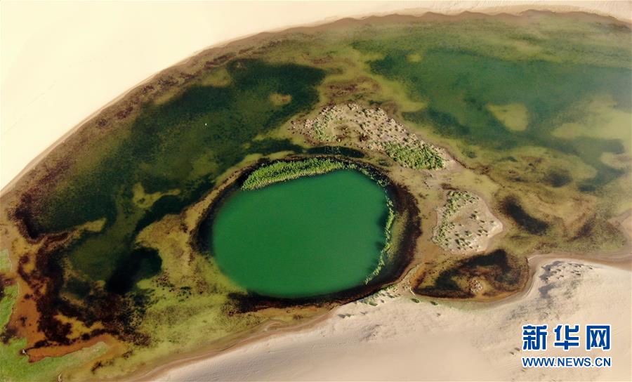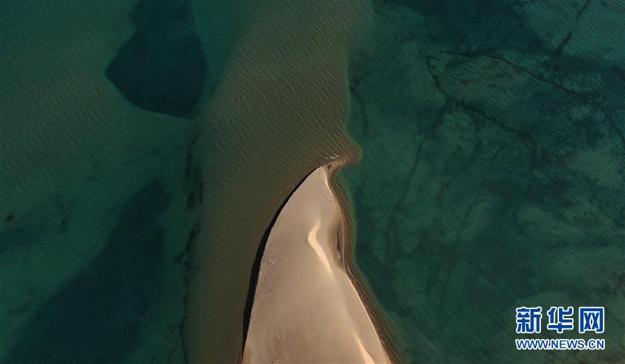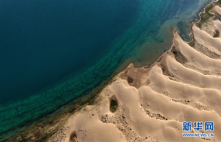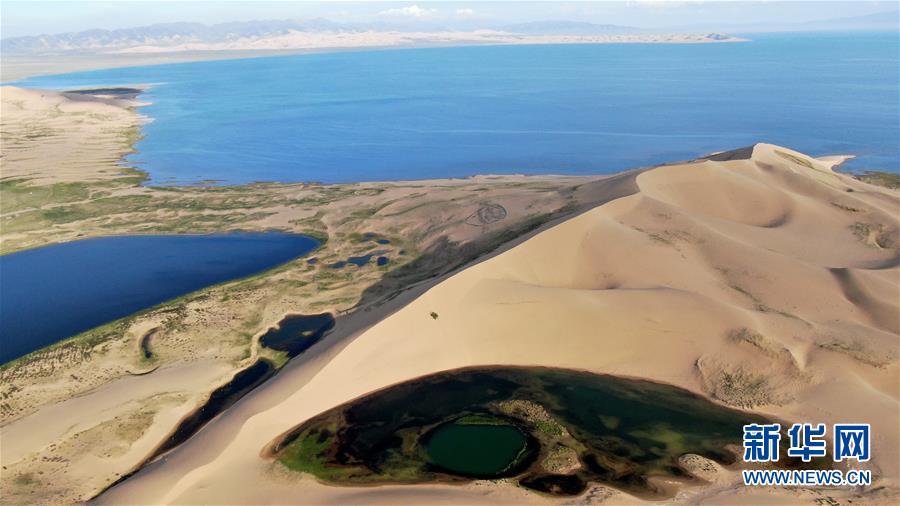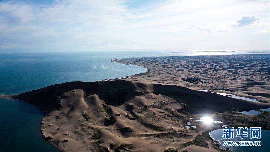 這是7月28日拍攝的青海湖沙島一隅(無人機照片)。盛夏傍晚,位于青海湖東北部的沙島,島內(nèi)湖泊星羅棋布,沙丘連綿起伏,風景別致。金沙與湖水掩映,在陽光的勾勒下形成一幅美麗的畫卷。新華社記者吳剛攝