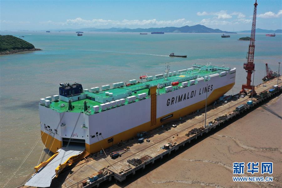 8月1日在位于螞蟻島的揚(yáng)帆集團(tuán)東海岸造船廠拍攝的一艘在建的汽車滾裝船,月底即將交付給意大利客戶(無(wú)人機(jī)照片)。新華社記者黃宗治攝