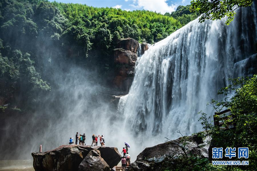 游客在位于貴州省赤水市的赤水大瀑布景區(qū)游玩(6月15日攝)。新華社記者陶亮攝