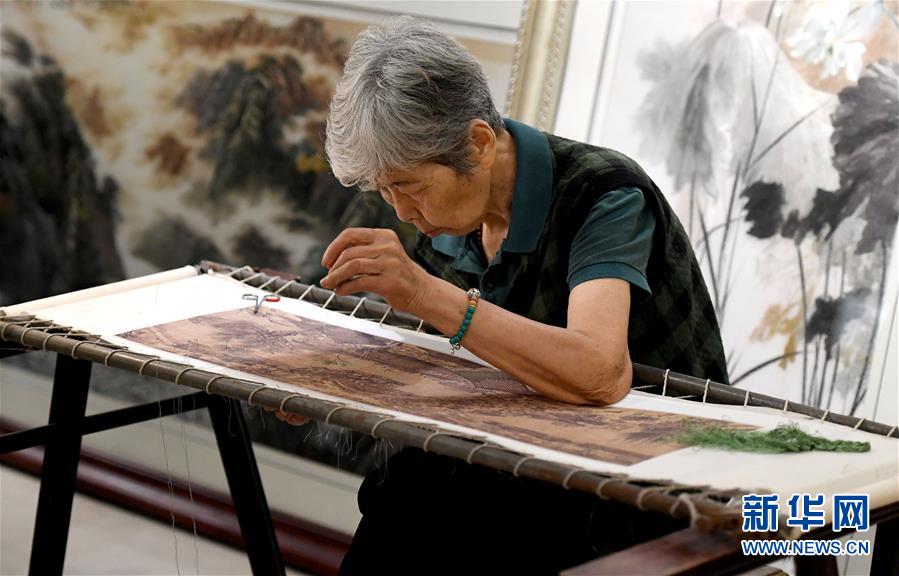 在開封市素花宋繡工藝有限公司的展示館里,王素花在刺繡(7月30日攝)。新華社記者李嘉南攝