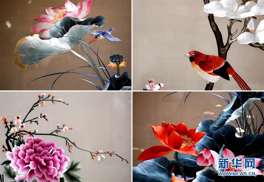 這是王素花和徒弟們的刺繡作品局部(拼版照片,7月30日攝)。新華社記者李安攝