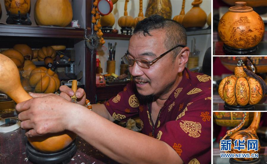 這是一張拼版照片。左:8月5日,侯景偉在葫蘆上進(jìn)行創(chuàng)作。右:侯景偉創(chuàng)作的葫蘆工藝品(8月5日攝)。今年55歲的吉林四平人侯景偉自幼與家人學(xué)習(xí)雕刻、烙畫藝術(shù)。經(jīng)過多年潛心研究,他將浮雕和烙畫工藝相結(jié)合,通過拋光、起稿、雕刻、烙燙、套色等十余道工藝,制作展現(xiàn)傳統(tǒng)文化、民俗故事的葫蘆工藝品。2020年,侯景偉被評(píng)為四平市非物質(zhì)文化遺產(chǎn)項(xiàng)目侯氏葫蘆雕刻烙畫代表性傳承人。他說(shuō):“希望有更多人加入到非遺傳承隊(duì)伍中,讓小葫蘆‘講’出更多民俗故事。”新華社記者張楠攝