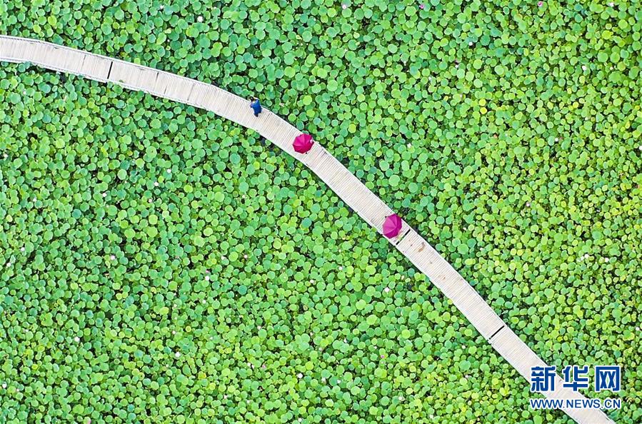 8月6日,游客在河北省永清縣里瀾城鎮(zhèn)金華湖觀賞荷花(無人機(jī)照片)。夏日時(shí)節(jié),河北省永清縣里瀾城鎮(zhèn)金華湖荷塘的荷花爭(zhēng)相開放,吸引市民和游客前來游玩觀賞。新華社記者李曉果攝