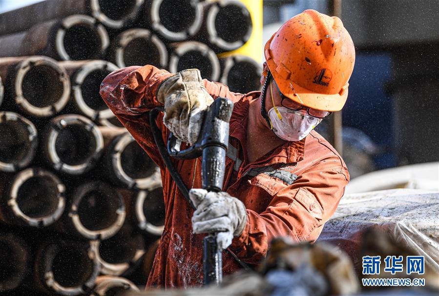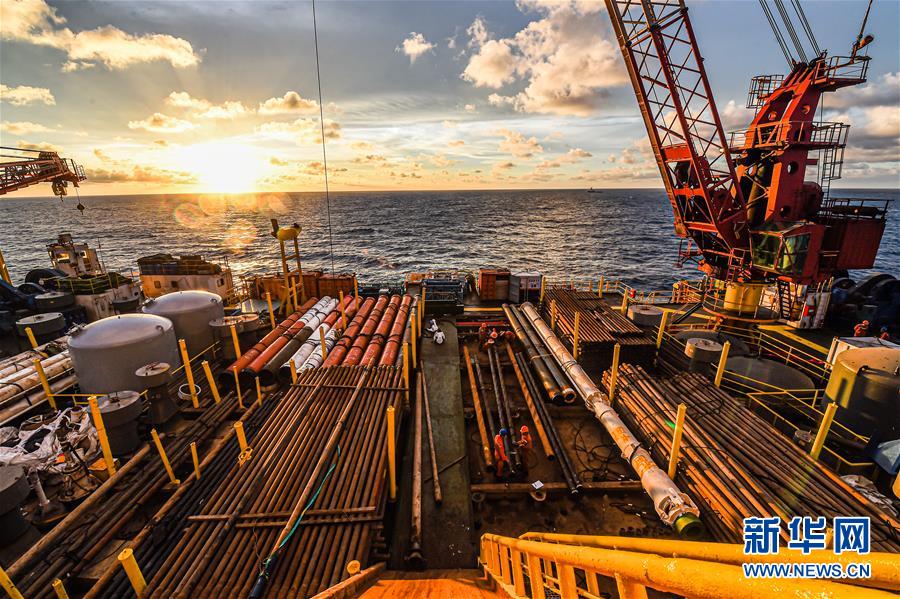 7月26日,在位于南海北部海域的勘探三號(hào)鉆井平臺(tái)上,鉆井工人在擺放鉆桿。新華社記者蒲曉旭攝